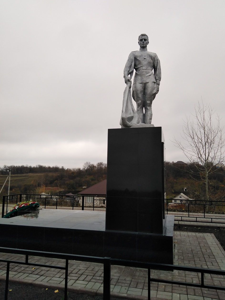 На постаменте высотой 1,5м. стоит советский солдат и в руках держит «Знамя Победы». С четырех сторон на постаменте выбиты фамилии и имена воинов, павших в боях с фашистскими захватчиками. На плите из металла сделан венок. Памятник огорожен.